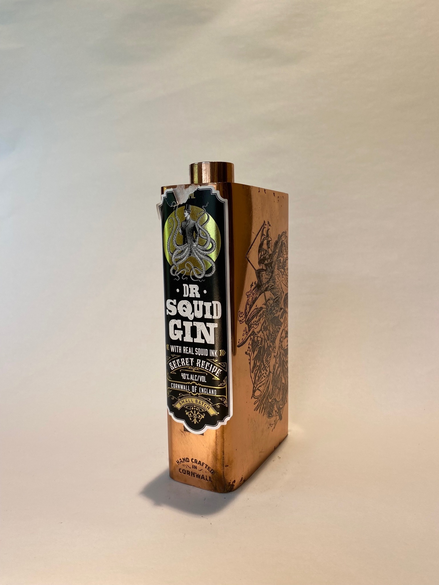 Dr. Squid Gin is handcrafted using a secret recipe that features real squid ink, contributing to its unique black color. The gin offers a savory profile with coastal notes, complemented by subtle citrus and spice elements. When mixed with tonic, it transforms into a vibrant pink hue, adding a visual spectacle to its consumption. The gin is presented in an engraved copper flask, reflecting the scenic beauty and wildlife of Cornwall.